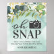 Rustic grey party-tecken med en blekt vattenfärg tvättat i bakgrunden, botaniskt eucalyptus löv, stänk av faux guld-folie, texten "oh snap", meddelande och hashtag.