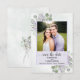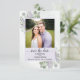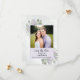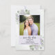 Det här bröllop spara datum-kortet är enkelt, rustiskt, elegant och vackert. Det innehåller ditt foto i en lavender eller lätt lila ram omgiven av en bevy av handmålade löv av eukalyptus och lavender-blommor på en marmorerad blek stålblå bakgrund. Rubriken lyder: Spara datum i äldre skriptcalligrafi med utrymme för parets namn, datum och plats. Baksidan har en liten bukett bunden med en vit bukett. Underbart sätt att låta dina vänner och din familj få veta om ditt kommande bröllop.