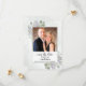 Det här bröllop spara datum-kortet är enkelt, rustiskt, elegant och vackert. Det har ett foto i en vit ram omgiven av en bevy av handmålade löv av eucalyptus och lavender-blommor på en marmorerad blek stålblå bakgrund. Rubriken lyder: Spara datum i äldre skriptcalligrafi med utrymme för parets namn, datum och plats. Baksidan har en liten bukett bunden med en vit bukett. Underbart sätt att låta dina vänner och din familj få veta om ditt kommande bröllop.