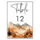 Escape to a serene autumn mountain retreat with your wedding table number card. This exquisite design showcases a breathtaking watercolor painting of a majestic mountain, surrounded by trees adorned with fall foliage. The muted natural tones of tan, brown, rust, gold and grays create a timeless and sophisticated atmosphere, reminiscent of a peaceful alpine escape at the pinnacle of the fall season. The clean white background and modern font text add a touch of contemporary elegance, balancing the natural beauty of the scene. This design will not only announce your special day but also set the perfect tone for a truly memorable celebration, inviting your guests to join you on a journey of autumn tranquility and love. Created by Simply Farmhouse Press.
