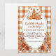 • A charming autumn watercolor design featuring a stack of orange pumpkins, a sweet fox, and a squirrel nestled among falling leaves and rustic floral bouquets. This delightful set is framed by an orange gingham border, perfect for a fall or harvest-themed baby shower.