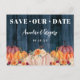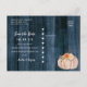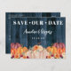 Rustic Fall Pumpkins Spara vårt vykort för datummeddelande med fallande blommigtar och pumpor i rostbrun, tangerin orange, djup merlot, burgundy och vinterkrämtans mot en blå träbakgrund.