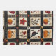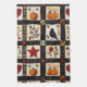 Kökshandduken visar en rustik, vinklad mönster som är placerad i kvadrater och rektangulära block med varma höstmotiv. I lapptäcket finns pumpor, en svart fågel med rödaktigt bröst, hjärta, röda stjärnor och blommigt grenar i ärliga röda nyanser, orange och brunt. Geometriska accenter som plaid och kor-stygch struktur bidrar till handgjorda känslor. Med en mysigt agrarestetik i svart, grädde och falltoner är mönster perfekt för höstdécor, primitiv land stil och rustika skördesäsongscharm.