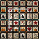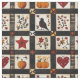 Den här väven visar en rustik vinklad mönster som är placerad i kvadrater och rektangulära block med varma höstmotiv. I lapptäcket finns pumpor, en svart fågel med rödaktigt bröst, hjärta, röda stjärnor och blommigt grenar i ärliga röda nyanser, orange och brunt. Geometriska accenter som plaid och kor-stygch struktur bidrar till handgjorda känslor. Med en mysigt agrarestetik i svart, grädde och falltoner är mönster perfekt för höstdécor, primitiv land stil och rustika skördesäsongscharm.
