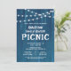 This rustic family reunion picnic invitation features a rustic blue background accented with strings of lights adorning the top of the invite.