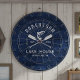 Lägg till en personlig i sjö hus eller i bergskusten med den här ritbordsritningen, med korsade öron och en hoppande fisk på en marin blå träbakgrund, med familjens namn, sjö-bostad och ett fastställt datum i textmallar som är lätta att använda.