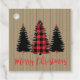 Rustic jordbrukshus har en trio av Evergreen träd silhouettes, en i rött och svart buffel plaid, God jul-text i festive red och en muterad vintage rand bakgrund