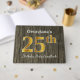 Gästsymbolen bok har ordnumret "25:e" med ett faux guld-liknande utseende. Den har också en skräddarsydd namn och en rustik träbakgrund. Den skulle kunna användas i party för någon som firar sin tjugofemte födelsedag. [~Z0000053]