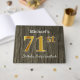 Gästsymbolen bok har ordnumret 71st med ett utseende som liknar faux/imitation guld. Den har också en personlig namn och en rustik träbakgrund. Den skulle kunna användas i party för att fira sin sjuttioårsdag. [~Z0000053]