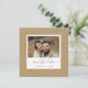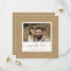 Ett enkelt och rustiskt pappert kraftverkskort bröllop spara datum med guld-skript och ett foto.