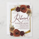 Vid middagsinbjudan i bröllop finns rustik olja som målats in på burgundisk, jordad höstblomma över grönt och pampasgräs med elegant ram och bakgrund i guld.