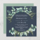 Chic och elegant botaniska bröllopsinbjudningar för eukalyptus. Ram innehåller bröllopsdagen med eukalyptus löv i grönt och blått bläcklöv med midnattsblå bakgrund och snyggtens vita bokstäver. Anpassa enkelt den här inbjudan med information om bröllopsdagen.
