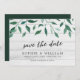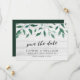 Den här Rustic Save the Date Card (spara datumkortet) innehåller italienska Ruscus med orden "spara datumet" i trendigets skript mot en blek träbakgrund på framsidan och en mörk grönt baksidan. Anpassa det här kortet genom att ersätta platshållartexten i mallen för att lägga till information. Om du vill ha fler alternativ som att ändra teckensnittet och det är storlekt/färg eller mellanrummet mellan brev klickar du på knappen "Anpassa". *Observera att Zazzle Watermark som visas i zoomförhandsvisningen INTE visas på den färdiga tryckta produkten. © Rosewood and Citrus