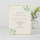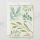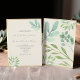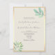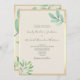 En naturinspirerad bröllopsinbjudan med handmålad vattenfärgsblad i mjuka gröntar, accentuerad av elegant guld kant. Den här designen kombinerar romantiskt skript med modern botanisk charm för ett färskt, tidlöst utseende. Den är en perfekt för runda, utomhus eller trädgårdsbröllop.