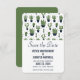 Bröllop spara datum-kort med en massa söt grönt accti i ett upprepande mönster. Grönt färgad cacti sitta i en mörk blått blomkruka. Små dekorativa trianglar mellan dem.