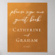Denna rustiska bröllop poster i guld har elegant vit typografi som överlagts på en underskattad marktongradient. Den enkla ljusa orangen och de bruna nyheterna följer den nuvarande nedgången för ett bröllop i Böhmen i höst. Skriv under vår gäst bok. Fyll i tecknet med ditt minimalistiska skript över toningen i färg.