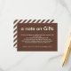 Vi presenterar presentkortet för höljet, en elegant och ett praktiskt tillÀgg till uppsamlingen för det ryska harmonin. Det hÀr rektangulÀra kortet har en rik brun bakgrund med subtil vit rand, som pÄminner om bröllop-temat. PÄ kortets framsida hÀlsar ett tÀnkvÀrt meddelande frÄn paret gÀsterna. Den ber dem vÀnligt att besöka parets bröllop webbplats för att kunna köpa en gÄva om de sÄ önskar. Webbplatsen adress visas pÄ en framtrÀdande plats med vitt teckensnitt mot bruna bakgrunder, vilket gör att det Àr lÀtt att lÀsa och komma Ät. Kortets baksida Àr helt enkelt försedd med brunt och vitt rand mönster, vilket gör att det praktiska kortet för djurutrymmet blir nÄgot sofistikerat. Kortet för djurutrymmet Àr utformat med försiktighet och uppmÀrksamhet pÄ detaljerna och fungerar som ett enkelt förslag till dina gÀster samtidigt som du behÄller elegansen och harmonin i ditt bröllop-tema.