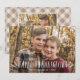 Fotokort för rustisk thanksgiving med texten "Happy thanksgiving" i vit, handskriven text med veteförråd. Anpassa framsidan av det söta Thanksgivingen genom att lägga till ett foto, namn och året. Kortet återgår till visningar med ett andra foto och ett valfritt meddelande med vattenfärgen mönster i bruna och beige nyanser.