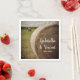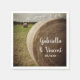 Den charmerande Pappra Napkins från Rustic Hay Bales Ranch Bröllop kan vara personlig med namn på bruden och brudgummen och datum för använda vid er avslappnad på landsbygdens stil i land eller möhippa giftermål och mottagning. Dessa engångsservetter av rustisk chic har ett fyrkantigt serverdelsfoto av runda häckbalar i en grönt på en blå himmel dag med vita utspridda moln.