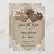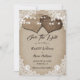 Rustic-landsbyggsbröllopet sparar datumkortet som innehåller brännhjärtor på en beige hessisk bakgrund med vit blommigt snöre och sträng ljus.