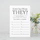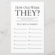 Det här bröllsspelet "Hur gamla var de?" är enkelt och charmerande - perfekt för alla bröllopsfestligheter som firar två brudgummar. Det här roliga och enkla spelet kommer säkert att ge massor av skratt på alla bröllopsfestligheter! Be familj och vänner skicka bilder på brudgummarna i olika åldrar och skriv ut dem. Numrera dem och placera dem nära dessa spelblad. Ge helt enkelt ett blad till varje gäst (glöm inte pennorna) och låt tävlingen börja! Du kommer bli förvånad över hur många som verkligen vet hur gamla brudgummarna var. Om några sekunder ser du hur ditt spelblad kommer att se ut. Välj helt enkelt "Anpassa denna mall" och skriv in brudgummarnas namn.