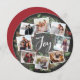 Ett festive-kort i en unik, rund form som innehåller åtta av dina favoritfoton i en rund andedräkt som accentueras av gröntens vattenfärgsblad, gräs-koner och röda hollbär på en kritbakgrund. "Joy" visas i mitten i penselskripttypografi med vita bokstäver. Anpassa baksidan av den här unika helgdag fotokollage-designen med anpassningsbarna Jul hälsning och namn i vit text på rött.