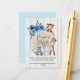 Ett pappersraffel biljett att ta med med dina inbjudningar. Den har en lätt träbakgrund. Det finns ett träsegment med blå blomaccenter på kant. Det finns djungeldjur: elefant, giraffe, apa och rino längs grund.