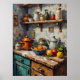 Den här målningen skildrar ett mysigt, rustiskt kök fyllt med olika föremål på en arrangemang som fortfarande är . Bilden kännetecknas av sitt kraftiga impasto struktur, med tjocka, uttryckliga penseldrag på hela yta, från de drabbade skåpen till de mönstrade väggarna. På scenen finns två trähyllor som innehåller ett urval av keramiska krukor och burk, medan disken nedan är försedd med en skarp orange, en skål av citrusfrukter och en tekanna i silver. Målningen framkallar en varm, homeisk atmosfär med en charmerande känsla för vintagen.