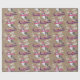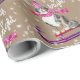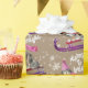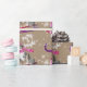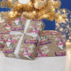 En julklapp märkre med en helgdag bakgrund med en vattenfärgad Bergskaberg hund klädd i rosa tuque och scarf på en lila och rosa som är slät med snöflingor och säger: Merry & Bright i ett upprepat mönster.