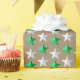 En papper pulverförpackning för juldagen med en klar grönt och silver vita stjärnor i ett upprepat mönster på en varm kraftverkspapper.
