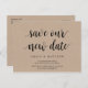Det här är det minsta moderna, enkla, Rustic Kraft-designtemat, i svart teckensnitt, Bröllopsfest-inbjudan Omschemaläggs-vykort (senareläggs/senareläggs) (spara vårt nya datum). Det är perfekten och eleganten som gör det möjligt att lägga om meddelandet till vänner och familj.