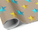 En papper slutförpackning för julens julhelg med turkosblåa och guld-stjärnor på en papper bakgrund av kraft. Underbar för alla tillfälle och gör en imponerande presentfigursättning.