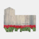 Favoritlåda med en rustik, avvanda ladugårdsmuren, framsida med ljusröda tulpaner.