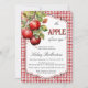 Firar din lilla med rustik charm! Den här "Apple of The Öga"-inbjudan till babydusch innehåller ett vattenfärgsrödat äpple gren, stil, som läggs över vintagens sönderrivna pappra och en blekt gingham-bakgrund för den perfekt jordbrukshuset i land. Perfekt för din mysiga babydusch i land.