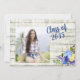 Rustik, vit, träbrädesbakgrund med fotomall, "Klass 2019" och blå, lila och gult blommigt bouquet i nedre högernas hörn. Partinbjudningsmallar på baksidan med samma bakgrund och blommigtar av trä.