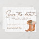 Ange tonen för ditt westerna bröllop med det här Rustic Land Spara datum med charmig cowboystövel, cowboyhatt och mjuka blommigtar på en rustisk träbakgrund. Perfekt för land brider och bröllop firande, den här utformningen blandar sydlig charm med romantisk elegans. Anpassa med din namn, datum och händelseinformation för att skapa en viktig fråga som dina gäster kommer att kärlek. Underbar för westernt, cowboyorienterat, rustiskt eller utomhuskallat bröllop.