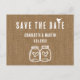 Minimalistiskt vykort i bröllop spara datum med modern kalligrafi som är perfekt för en rustisk bröllopsfest i land/bakgård/ladugård.