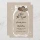 Personlig Rustic Mason burk bröllop spara datum-kort som innehåller en Mason burk och brännhjärtan mot en ljusspiralbakgrund som är försedd med ljus. Anpassa enkelt onlinen. Matchningsartiklar som är tillgängliga för att komplettera dessa Mason burk bröllop spara datum.