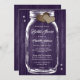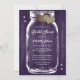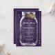 Personlig lila Rustic mason burk inbjudningskort för möhippan med en mason burk med två brännhjärtor mot en lada-bakgrund. Matchande objekt är tillgängliga.