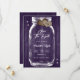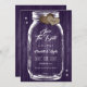 Personlig lila rustic mason burk bröllop spara datum-kort med en mason burk och brännhjärtan mot en lada-bakgrund som är försedd med skinklig ljus. Anpassa enkelt onlinen. Matchningsartiklar som är tillgängliga för att komplettera dessa lila bröllop spara datum.