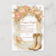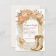 En chic babyduschdesign med cowgirl-skor som är accentuerade med rosa-peonier, mjuk grey och skarpa detaljer om guld. Perfekt för ett firande med western tema och en feminin blommigt-tvist.