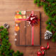Vintertema för Land jul med rustik mörk som är papper och som har en bakgrund av trä och glänsande Juldekorationer.