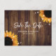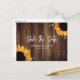 Personlig solroskort bröllop spara datum med solblommor på en lada med baksida av ljus. De här vykorten i blommigt bröllop spara datum är perfekter för ett rustiskt land, eller en lada sommar, eller faller bröllopet party.
