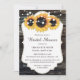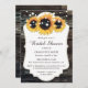 Ett sött, rustiskt trä och solrosblomma inbjudningskort för möhippan med solblommor på en lada-träbakgrund, försedd med sträng ljus. Matchande objekt är tillgängliga.