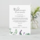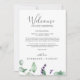 Dessa roliga lavender bröllop välkomnar brev och färdkort är perfekt för ett enkelt och elegant utomhus bröllop. Blommigtens utformning har vattenfärgen eukalyptus löv och grönt med sprit av lila vilda blommor. På kortets framsida finns ett välkommet brev och på kortets baksida finns en rutt i bröllop. Dessa anteckningar är perfekt för destinationsbröllop och hotellgästväskor.