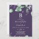 Den här lila- och bröllopsinbjudan är perfekt för ett enkelt och elegant utomhus bröllop. Blommigtens utformning har vattenfärgen eukalyptus löv och grönt med sprit av lila vilda blommor på plommons lila. Anpassa kortet med ditt sista monogram.