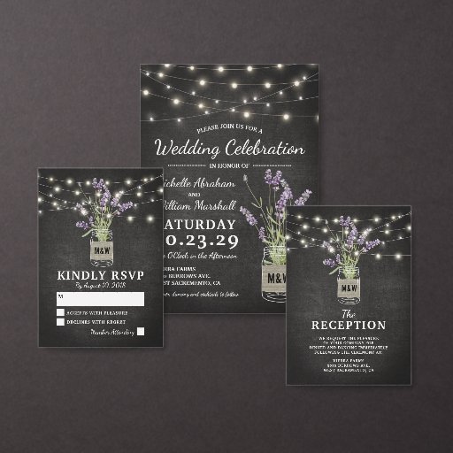 Lägg era gäster i landsbyggsbröllopets fantastiska charm med våra vackra inbjudningar. De här bröllopsinbjudningarna i chicen i land blandar på ett perfekt sätt en rustik svart kritbakgrund med en fin sträng ljus för att få en intressant beröring. Mästerstycket är en mason burk som brinner med lila lavender-blommor som är inklädda i en spiral och förkroppsligade med parets initialer. En mall för enkel personlig bröllop lägger till den avslutande beröringen till dessa unika inbjudningar.
