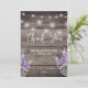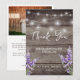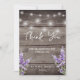 Rustic with dark wood texture, lavender flowers, string lights and with script and fun modern typography. Inside is your favorite wedding photo and custom message thank you card.