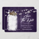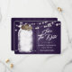 Rustic lila bröllop spara datum-kort med mynningen burk och brännhjärtorna mot en lingbakgrund med strängen ljus. Anpassa enkelt denna romantiska, rustiska lila bröllop spara datum online. Matchningsartiklar som är tillgängliga för att komplettera det lila bröllop spara datum.