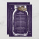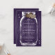 Rustic lila bröllopsinbjudan med en mason burk och burlap-hjärtan på en lada-bakgrund.